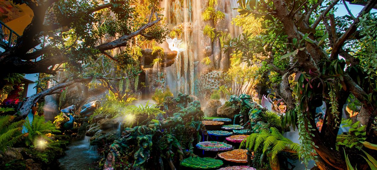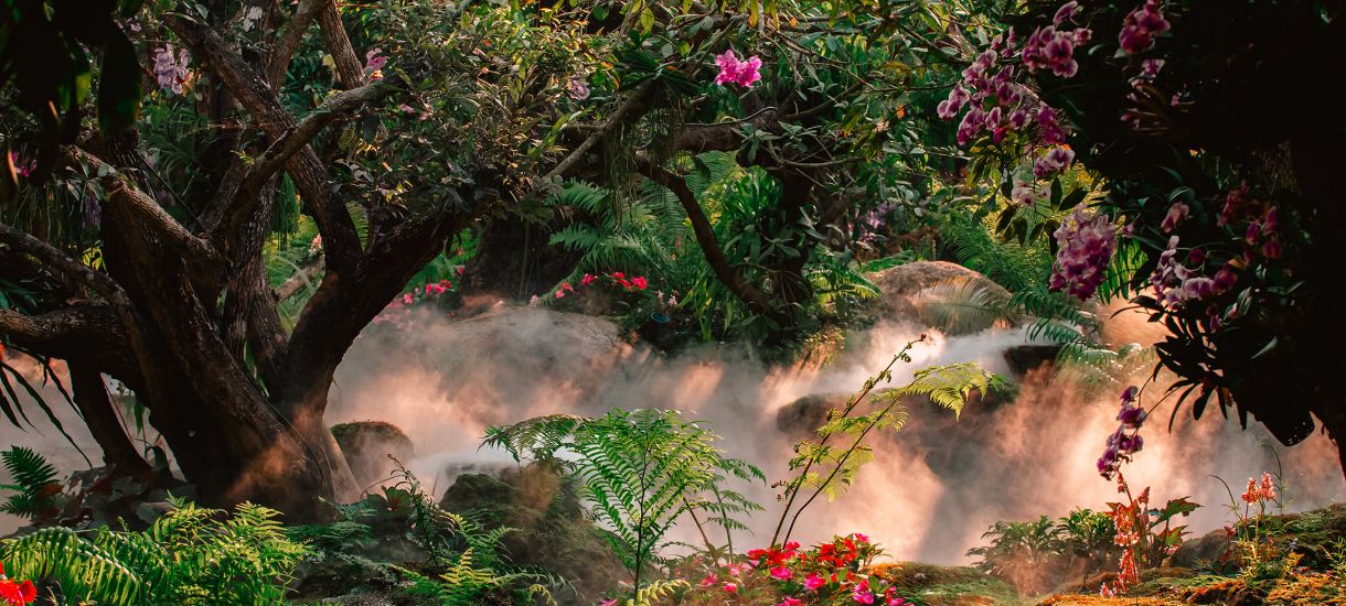 You can hang out indoors or wander out on the cobblestone path. That’s where things get even more special. There’s a misty garden full of blooming orchids, a pond of colorful Koi swimming around, and a stunning cascade flowing gently. Everything blends so beautifully, it just makes you want to slow down, breathe, and truly soak it all in.