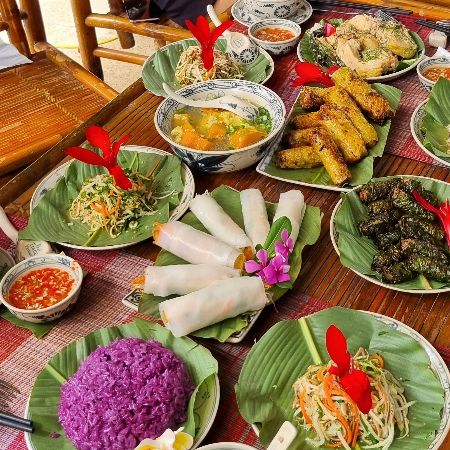 Say goodbye to Mr. Duoc to visit another local house, which is only a 10-minute drive away, where you will learn to cook Vietnamese dishes and have lunch under the big canopy of a lychee tree. It’s a pleasure to know that most of the vegetables in our meals come from the nearby garden. After lunch, you will cycle with Mrs. Chin, the home host. You will naturally be drawn to beautiful scenery like the Ba Vi Mountains, Da River, grasslands, rice fields, and arrowroots during the ride. You will cycle through primary schools, village community houses, and ancient tile-roofed houses, and will be welcomed with warm smiles by the locals. Stop by to visit families who run small businesses, supplying products directly to the villagers. Your cycling will finish with a relaxing herbal foot bath.
